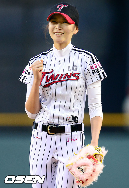 12일 오후 서울 잠실구장에서 열린 '2012 팔도 프로야구' LG 트윈스와 SK 와이번스의 경기전 슈퍼모델 장지은이 미소를 짓고 있다.