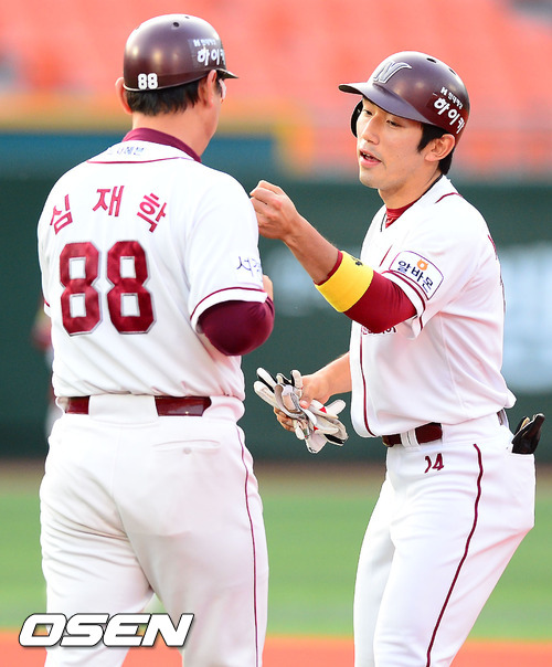 12일 오후 목동구장에서 열린 '2012 팔도 프로야구' 넥센 히어로즈와 KIA 타이거즈의 경기에서 1회말 2사 주자 만루 넥센 서건창이 좌익수 뒤 2타점 적시타를 날린 후 2루에서 심재학 코치와 하이파이브를 하고 있다.