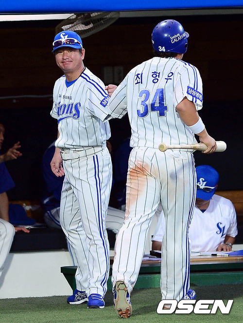 12일 오후 대구 시민구장에서 열린 '2012 팔도 프로야구' 삼성 라이온즈와 한화 이글스의 경기 3회말 2사 3루 손주인의 1타점 적시타에 홈을 밟은 최형우가 덕아웃에서 류중일 감독과 하이파이브를 하고 있다.