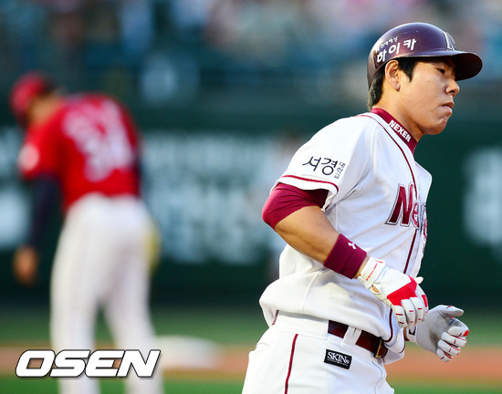 12일 오후 목동구장에서 열린 '2012 팔도 프로야구' 넥센 히어로즈와 KIA 타이거즈의 경기에서 4회말 2사 주자 2루 넥센 강정호가 좌월 투런 홈런을 날린 후 그라운드를 돌고 있다.