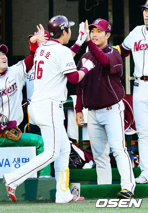 12일 오후 목동구장에서 열린 '2012 팔도 프로야구' 넥센 히어로즈와 KIA 타이거즈의 경기에서 4회말 2사 주자 2루 넥센 강정호가 좌월 투런 홈런을 날린 후 덕아웃에서 김병현과 하이파이브를 하고 있다.