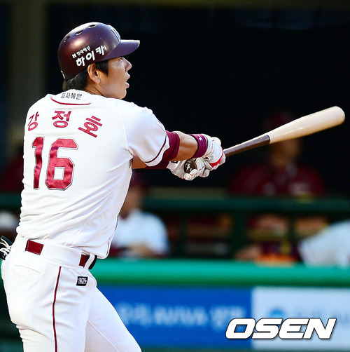 12일 오후 목동구장에서 열린 '2012 팔도 프로야구' 넥센 히어로즈와 KIA 타이거즈의 경기에서 4회말 2사 주자 2루 넥센 강정호가 좌월 투런 홈런을 날린 후 타구를 바라보고 있다.