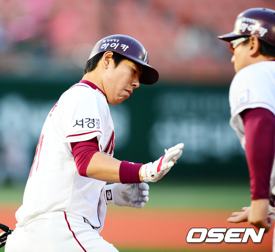 12일 오후 목동구장에서 열린 '2012 팔도 프로야구' 넥센 히어로즈와 KIA 타이거즈의 경기에서 4회말 2사 주자 2루 넥센 강정호가 좌월 투런 홈런을 날린 후 1루에서 심재학 코치와 하이파이브를 하고 이싿.