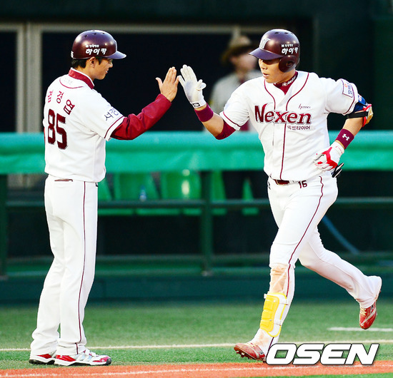 12일 오후 목동구장에서 열린 '2012 팔도 프로야구' 넥센 히어로즈와 KIA 타이거즈의 경기에서 4회말 2사 주자 2루 넥센 강정호가 좌월 투런 홈런을 날린 후 3루에서 염경엽 코치와 하이파이브를 하고 있다.