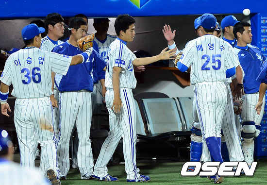 12일 오후 대구 시민구장에서 열린 '2012 팔도 프로야구' 삼성 라이온즈와 한화 이글스의 경기 5회초를 마친 배영수가 덕아웃에서 동료들의 격려를 받고 있다.