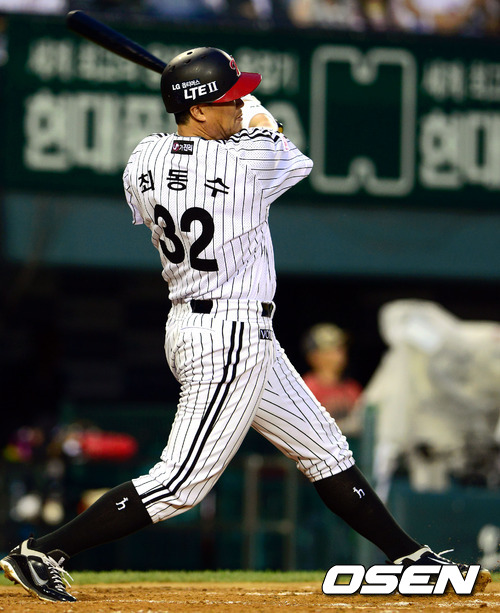 12일 오후 서울 잠실구장에서 열린 '2012 팔도 프로야구' LG 트윈스와 SK 와이번스의 경기, 3회말 2사 2,3루 LG 최동수가 2타점 1루타를 치고 있다.