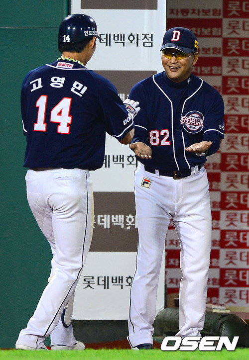 12일 오후 부산 사직구장에서 열린 2012 팔도 프로야구 롯데 자이언츠와 두산 베어스의 경기 5회초 1사 두산 고영민이 동점 솔로홈런을 날린후 김진욱 감독과 하이파이브를 하고 있다