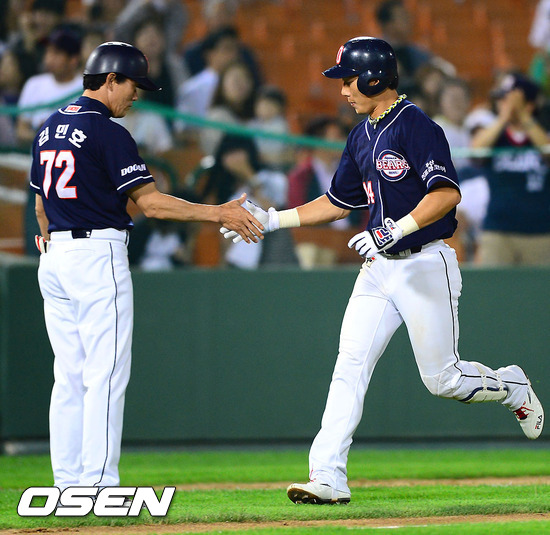 12일 오후 부산 사직구장에서 열린 2012 팔도 프로야구 롯데 자이언츠와 두산 베어스의 경기 5회초 1사 두산 고영민이 동점 솔로홈런을 날린후 김민호 코치와 하이파이브를 하고 있다