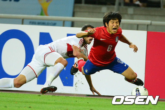 12일 오후 고양종합운동장에서 열린 2014 브라질 월드컵 최종예선 2차전 한국과 레바논의 경기, 전반 한국 박주호가 레바논 수비수의 태클에 걸려 넘어지고 있다.
