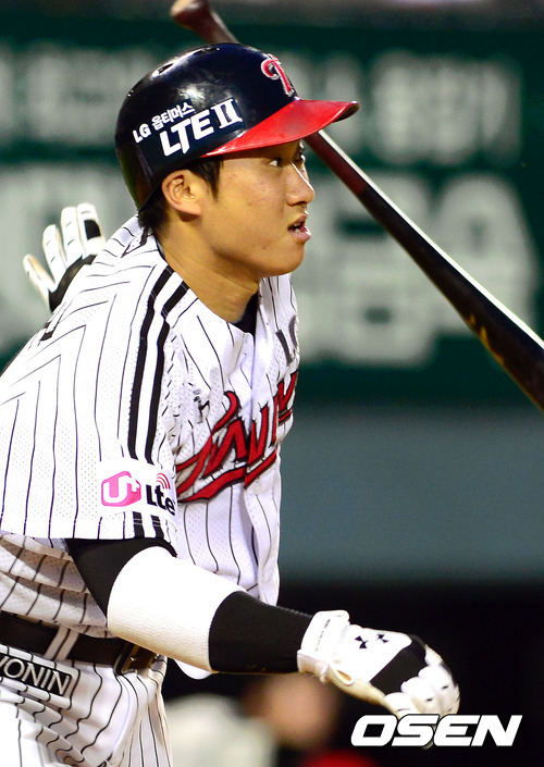 12일 오후 서울 잠실구장에서 열린 '2012 팔도 프로야구' LG 트윈스와 SK 와이번스의 경기, 3회말 2사 1,2루 LG 김태군이 1타점 1루타를 치고 있다.