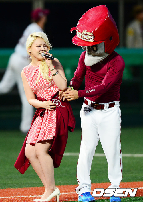 12일 오후 목동구장에서 열린 '2012 팔도 프로야구' 넥센 히어로즈와 KIA 타이거즈의 경기에서 클리닝 타임에 가수 알리가 그라운드에 나와 열창을 할때 바람이 불어 치마가 들리자 턱돌이가 자신의 유니폼을 벗어 치마를 가려주고 있다.