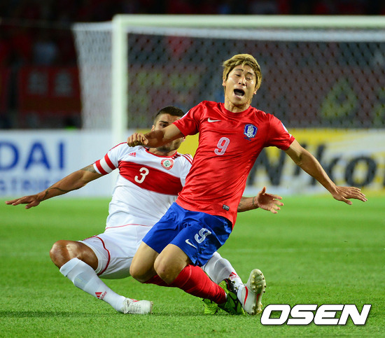 12일 오후 고양종합운동장에서 열린 2014 브라질 월드컵 최종예선 2차전 한국과 레바논의 경기, 전반 한국 이근호가 레바논 수비수의 태클에 걸려 넘어지고 있다.