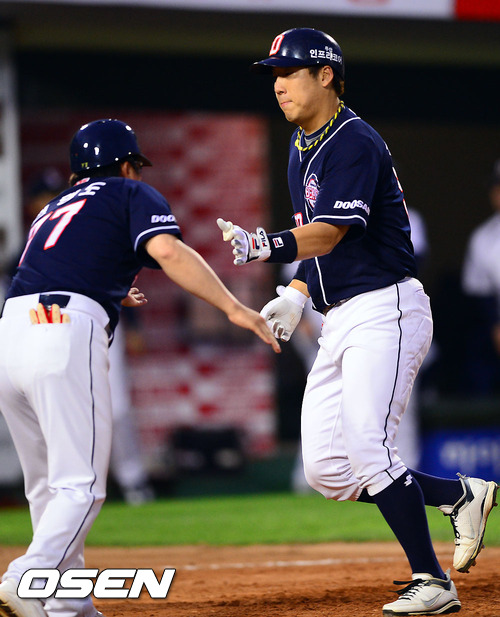 12일 오후 부산 사직구장에서 열린 2012 팔도 프로야구 롯데 자이언츠와 두산 베어스의 경기 4회초 두산 선두타자 김현수가 홈을 밟고 있다