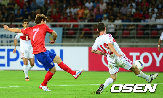 12일 오후 고양종합운동장에서 열린 2014 브라질 월드컵 최종예선 2차전 한국과 레바논의 경기, 전반 한국 김보경이 선제골을 넣고 있다.