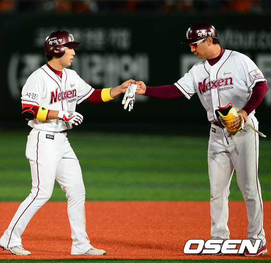 12일 오후 목동구장에서 열린 '2012 팔도 프로야구' 넥센 히어로즈와 KIA 타이거즈의 경기에서 6회말 2사 주자 2,3루 넥센 서건창이 중견수 앞 1타점 적시타를 날린 후 2루에서 심재학 코치와 하이파이브를 하고 있다.