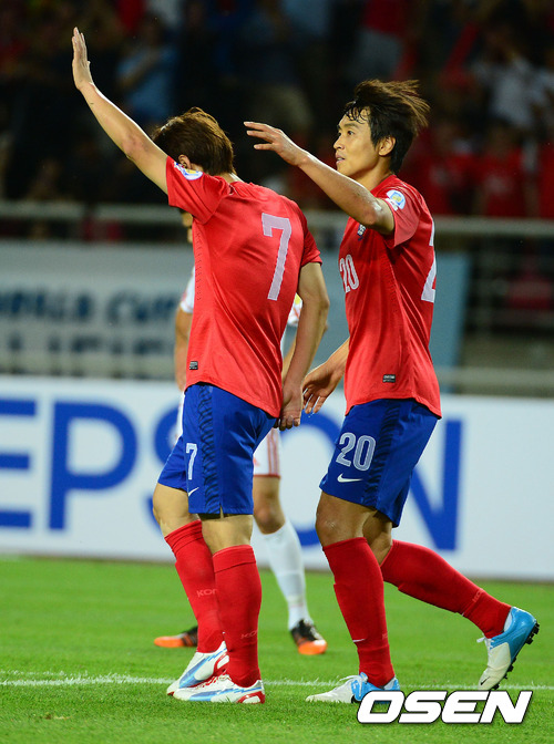 12일 오후 고양종합운동장에서 열린 2014 브라질 월드컵 최종예선 2차전 한국과 레바논의 경기, 전반 한국 김보경이 선제골을 넣고 이동국의 축하를 받고 있다.