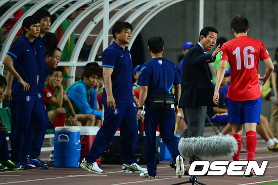 12일 오후 고양종합운동장에서 열린 2014 브라질 월드컵 최종예선 2차전 한국과 레바논의 경기, 전반 한국 기성용이 부상으로 교체되자 최강희 감독이 걱정스런 표정을 짓고 있다.