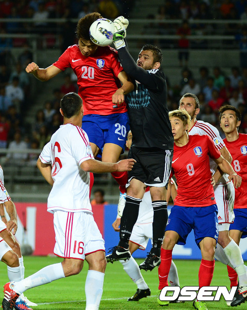 12일 오후 고양종합운동장에서 열린 2014 브라질 월드컵 최종예선 2차전 한국과 레바논의 경기, 전반 한국 이동국의 헤딩슛에 앞서 레바논 골키퍼가 볼을 쳐내고 있다.