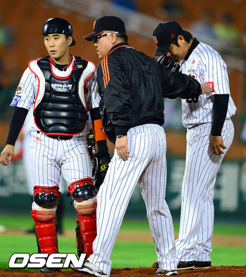 12일 오후 부산 사직구장에서 열린 2012 팔도 프로야구 롯데 자이언츠와 두산 베어스의 경기 7회초 2사 2,3루 두산 정수빈의 타석때 롯데 양승호 감독이 마운드에 올라 이승호 투수를 격려하고 있다.