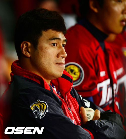 12일 오후 목동구장에서 열린 '2012 팔도 프로야구' 넥센 히어로즈와 KIA 타이거즈의 경기에서 6회에 넥센이 KIA를 13점차로 앞서나가자 KIA 서재응이 덕아웃에서 아쉬운 표정으로 팔짱을 끼며 경기를 지켜보고 있다.