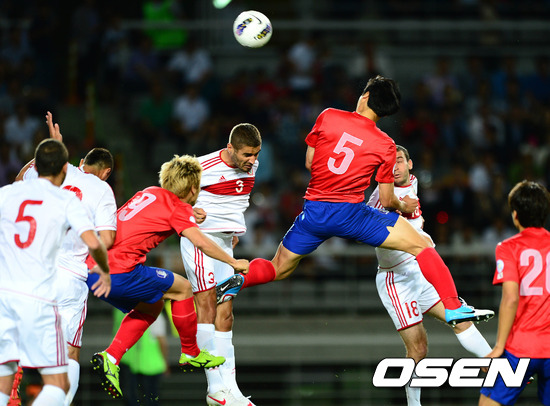 12일 오후 고양종합운동장에서 열린 2014 브라질 월드컵 최종예선 2차전 한국과 레바논의 경기, 전반 한국 곽태휘가 헤딩슛을 시도하고 있다.