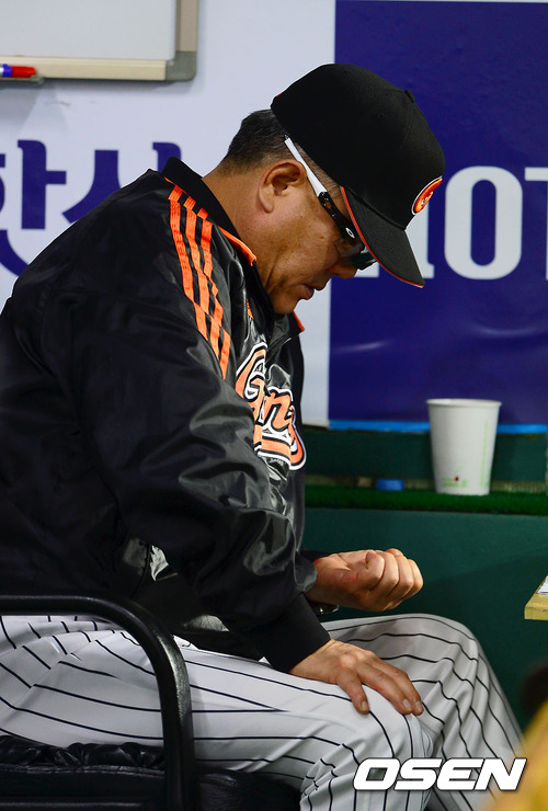 12일 오후 부산 사직구장에서 열린 2012 팔도 프로야구 롯데 자이언츠와 두산 베어스의 경기 8회초 롯데 강영식 투수가 1사 이후 연속볼넷을 허용했다. 양승호 감독이 고개를 숙인채 생각에 잠겨 있다.