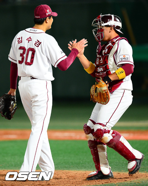경기를 마치고 넥센 김수경과 지재옥이 하이파이브를 하고 있다. / rumi@osen.co.kr