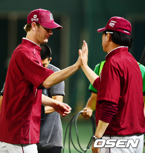 경기를 마치고 넥센 밴 헤켄이 김시진 감독과 하이파이브를 하고 있다. / rumi@osen.co.kr