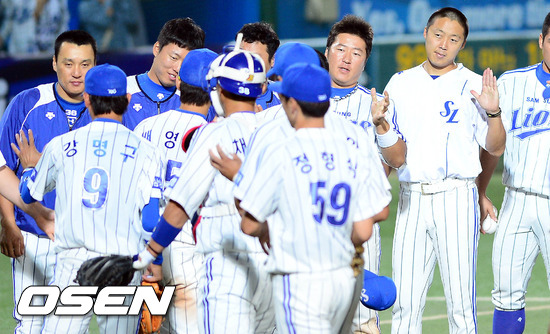 12일 오후 대구 시민구장에서 열린 '2012 팔도 프로야구' 삼성 라이온즈와 한화 이글스의 경기 종료 후 삼성 선수들이 하이파이브를 하고 있다.