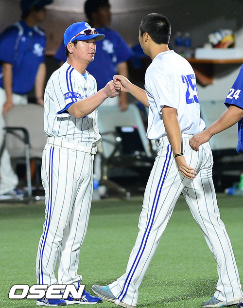 12일 오후 대구 시민구장에서 열린 '2012 팔도 프로야구' 삼성 라이온즈와 한화 이글스의 경기 종료 후 류중일 감독과 배영수가 하이파이브를 하고 있다.