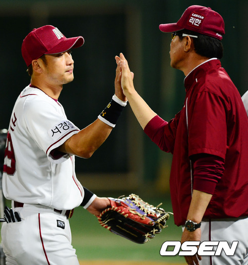 경기를 마치고 넥센 이택근이 김시진 감독과 하이파이브를 하고 있다. / rumi@osen.co.kr