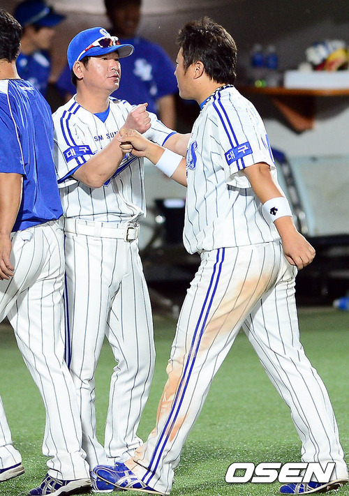 12일 오후 대구 시민구장에서 열린 '2012 팔도 프로야구' 삼성 라이온즈와 한화 이글스의 경기 종료 후 류중일 감독이 최형우와 하이파이브를 하고 있다.