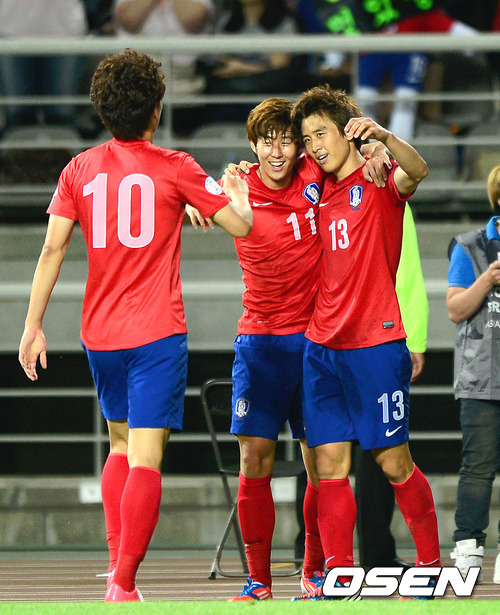 12일 오후 고양종합운동장에서 열린 2014 브라질 월드컵 최종예선 2차전 한국과 레바논의 경기, 후반 한국 구자철이 팀의 세번째 골을 성공시키고 동료들의 축하를 받고 있다.
