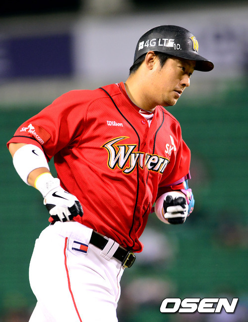 12일 오후 서울 잠실구장에서 열린 '2012 팔도 프로야구' LG 트윈스와 SK 와이번스의 경기, 8회초 2사 1루 SK 안치용이 좌측 담장을 넘기는 2점 홈런을 치고 베이스를 돌고 있다.