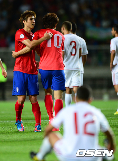 12일 오후 고양종합운동장에서 열린 2014 브라질 월드컵 최종예선 2차전 한국과 레바논의 경기 종료 후 한국 선수들이 승리의 기쁨을 나누고 있다.