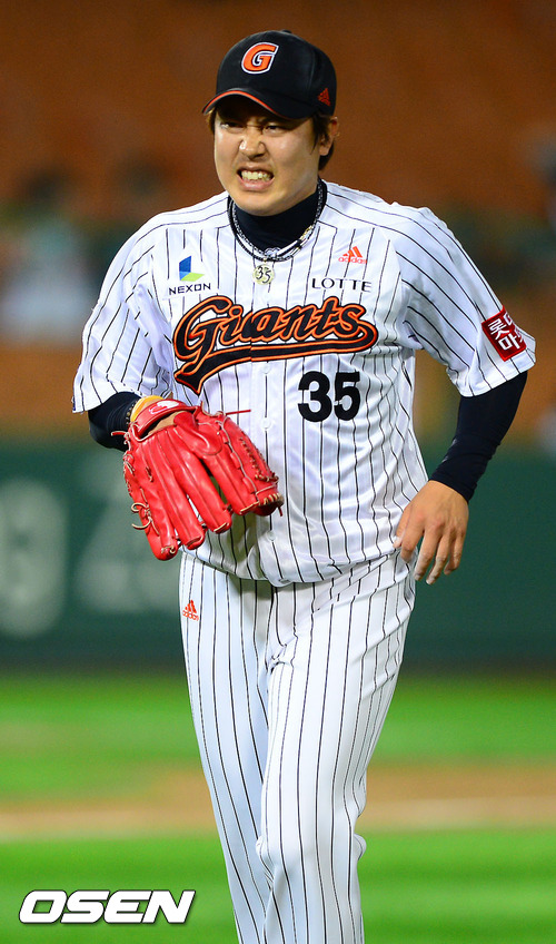 12일 오후 부산 사직구장에서 열린 2012 팔도 프로야구 롯데 자이언츠와 두산 베어스의 경기 연장 10회초 2사 1,2루 두산 이성열을 삼진아웃 잡은 롯데 이명우 투수가 힘든 표정으로 더그아웃으로 들어가고 있다.