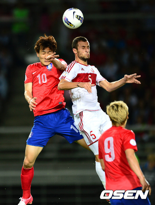 12일 오후 고양종합운동장에서 열린 2014 브라질 월드컵 최종예선 2차전 한국과 레바논의 경기, 후반 한국 지동원이 레바논 수비수와 공중볼 다툼을 하고 있다.