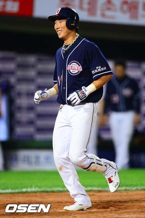12일 오후 부산 사직구장에서 열린 2012 팔도 프로야구 롯데 자이언츠와 두산 베어스의 경기 연장 11회초 2사 두산 고영민이 역전 솔로홈런을 날리고 홈을 밟고 있다.