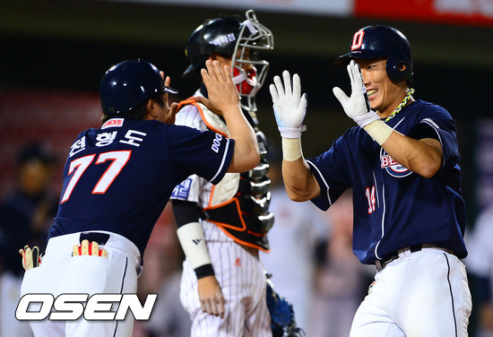 12일 오후 부산 사직구장에서 열린 2012 팔도 프로야구 롯데 자이언츠와 두산 베어스의 경기 연장 11회초 2사 두산 고영민이 역전 솔로홈런을 날리고 홈을 밟고 있다.
