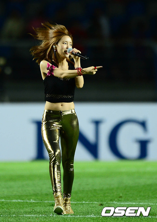 12일 오후 고양종합운동장에서 열린 2014 브라질 월드컵 최종예선 2차전 한국과 레바논의 경기, 하프타임 그룹 티아라 효민이 축하공연을 펼치고 있다.