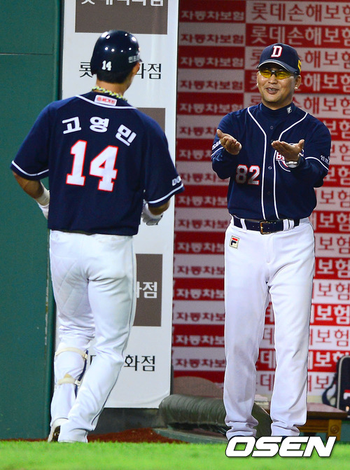 12일 오후 부산 사직구장에서 열린 2012 팔도 프로야구 롯데 자이언츠와 두산 베어스의 경기 연장 11회초 2사 두산 고영민이 역전 솔로홈런을 날렸다. 김진욱 감독이 고영민과 하이파이브를 하고 있다.