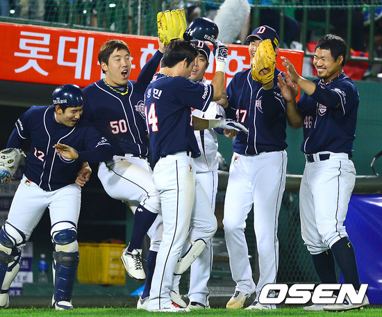 12일 오후 부산 사직구장에서 열린 2012 팔도 프로야구 롯데 자이언츠와 두산 베어스의 경기 연장 11회초 2사 두산 고영민이 역전 솔로홈런을 날린 뒤 동료들의 축하를 받고 있다.