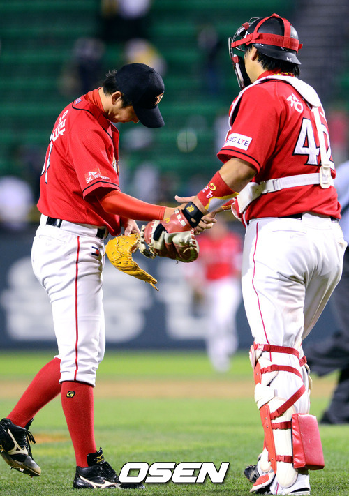 경기 종료 후 SK 정우람과 정상호가 악수를 하고 있다. / youngrae@osen.co.kr