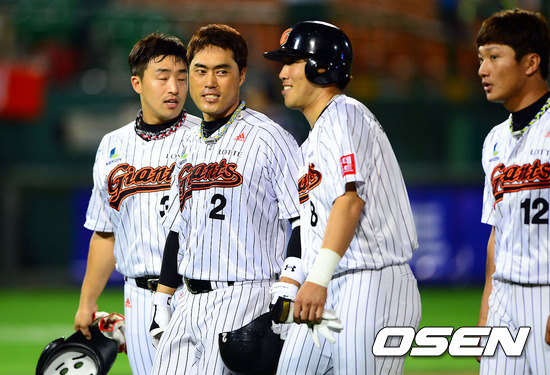 경기종료 후 끝내기 밀어내기 볼넷 만든 롯데 조성환이 동료들과 승리의 기쁨을 나누고 있다. / soul1014@osen.co.kr