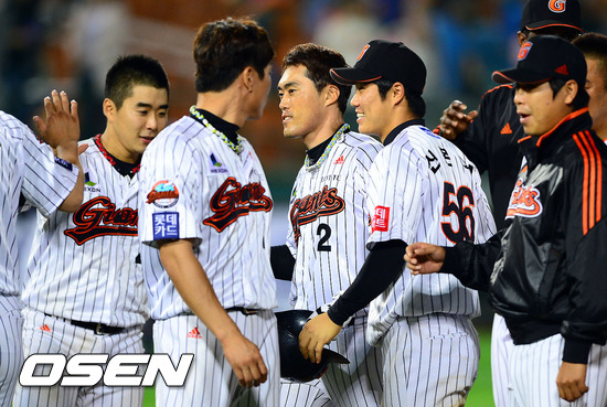 경기종료 후 끝내기 밀어내기 볼넷 만든 롯데 조성환이 동료들과 승리의 기쁨을 나누고 있다. / soul1014@osen.co.kr