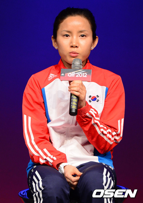 펜싱 남현희가 미디어 인터뷰를 하고 있다.