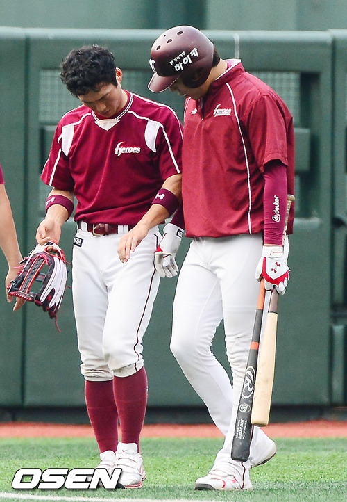 13일 오후 목동구장에서 '2012 팔도 프로야구' 넥센 히어로즈와 KIA 타이거즈의 경기가 열릴 예정인 가운데 양 팀 훈련시간에 넥센 강정호의 배팅볼에 맞은 정수성이 고통을 호소하자 강정호가 다가가 상태를 살피고 있다.