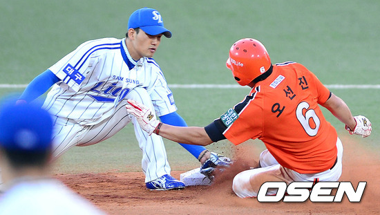 13일 오후 대구 시민구장에서 열린 '2012 팔도 프로야구' 삼성 라이온즈와 한화 이글스의 경기 3회초 2사 1루 장성호의 타석, 오선진이 도루에 성공하고 있다.