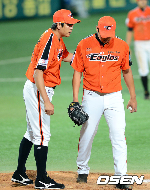 13일 오후 대구 시민구장에서 열린 '2012 팔도 프로야구' 삼성 라이온즈와 한화 이글스의 경기 4회말 정민철 코치가 유창식을 박정진으로 교체시키고 있다.
