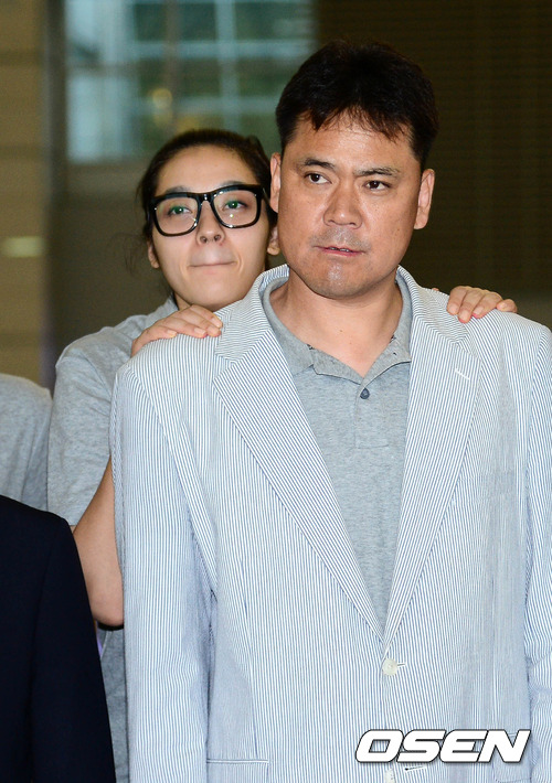 정선화가 이호근 감독의 기념촬영 중 이호근 감독의 어깨에 손올리며 장난을 치고 있다.